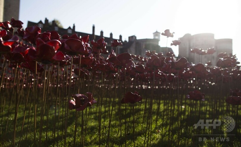 【11月12日 AFP】英ロンドン(London)のロンドン塔(Tower of London)で、第1次世界大戦(World War I)の休戦記念日(Armistice Day)に当たる11日、第1次大戦で犠牲となった英兵の数と同じ88万8246本の磁器でできた真っ赤なポピー(ケシの花)で塔の堀を覆うインスタレーション作品が完成した。