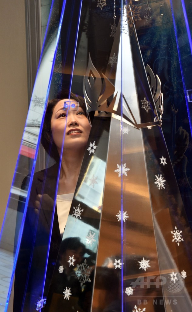 【11月20日 AFP】東京・銀座の田中貴金属ジュエリー(Tanaka Kikinzoku Jewelry)は19日、ディズニー(Disney)の大ヒット映画『アナと雪の女王(Frozen)』のキャラクターらがあしらわれたクリスマスツリーを公開した。高さ2.6メートル、重さ31キロのこのツリーは、純プラチナ製で最上部には星型の飾りが付いている。価格は3億円で、クリスマス当日まで展示される。(c)AFP