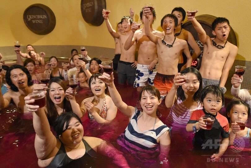 【11月20日 AFP】神奈川県箱根町の温泉テーマパーク「箱根小涌園ユネッサン(Hakone Kowakien Yunessun)」で20日、2014年の「ボージョレ・ヌーボー(Beaujolais Nouveau)」解禁を祝い「ボージョレ・ヌーボー風呂」が始まった。同日には仏ブルゴーニュ(Burgundy)のワインメーカー「ラブレ・ロワ(Laboure-Roi)」社のチボー・ガラン(Thibault Garin)副社長とミス・ブルゴーニュのマリー・レインツ(Marie Reintz)さんも訪れ、温泉客に初物ワインを振る舞った。毎年恒例の限定イベントは30日まで。(c)AFP