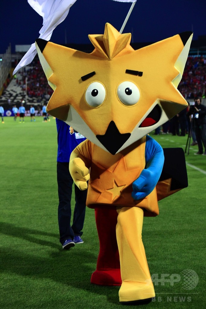 【11月21日 AFP】18日にチリの首都サンティアゴ(Santiago)で行われたチリ対ウルグアイのサッカー国際親善試合に登場した2015年コパ・アメリカ(2015 Copa America)のマスコット。(c)AFP