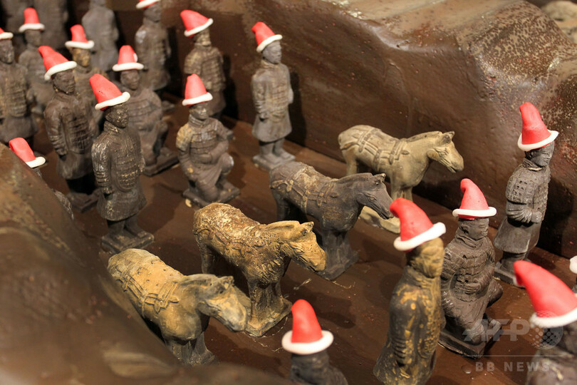サンタの帽子かぶった「チョコ兵馬俑」、中国・陝西省