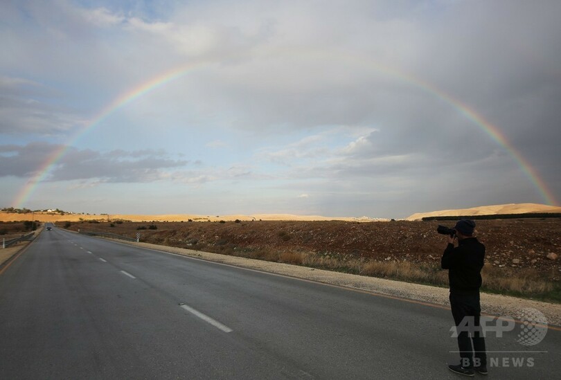 【11月28日 AFP】パレスチナ自治区ヨルダン川西岸(West Bank)エリコ(Jericho)近郊のヨルダン渓谷(Jordan Valley)で撮影された虹。同地域は24日より厳しい冬の嵐に見舞われており、国連(UN)は27日、異常気象や洪水の発生を受け、ガザ市(Gaza City)に「非常事態」を宣言した。(c)AFP
