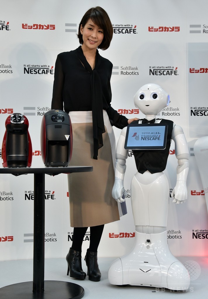 ネスレ日本とソフトバンクの共同声明によると、Pepperは接客相手との会話を通じて相手のニーズを把握することでコーヒーマシンの販売促進に貢献するという。ネスレは今後、国内の家電量販店など1000店舗にPepperを店員として導入する計画だ。(c)AFP