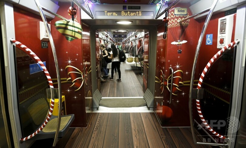 【12月2日 AFP】ブラジルのサンパウロ(Sao Paulo)市内を走る、サンパウロ地下鉄(Sao Paulo Metro)4号線(通称イエローライン)のクリスマス向け特別仕様車両。車内にはクリスマスオーナメントやリボンなどのイメージが施されており、普段とは違う雰囲気が味わえそうだ。(c)AFP