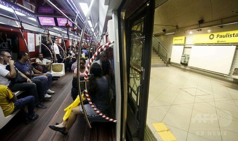【12月2日 AFP】ブラジルのサンパウロ(Sao Paulo)市内を走る、サンパウロ地下鉄(Sao Paulo Metro)4号線(通称イエローライン)のクリスマス向け特別仕様車両。車内にはクリスマスオーナメントやリボンなどのイメージが施されており、普段とは違う雰囲気が味わえそうだ。(c)AFP