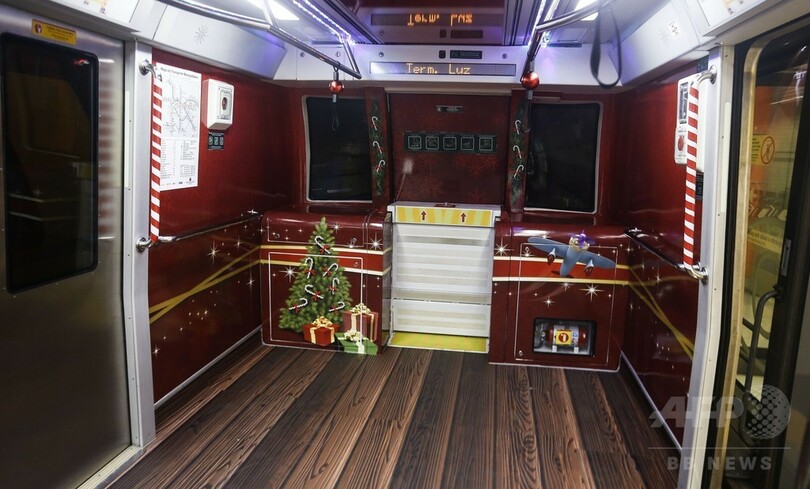 【12月2日 AFP】ブラジルのサンパウロ(Sao Paulo)市内を走る、サンパウロ地下鉄(Sao Paulo Metro)4号線(通称イエローライン)のクリスマス向け特別仕様車両。車内にはクリスマスオーナメントやリボンなどのイメージが施されており、普段とは違う雰囲気が味わえそうだ。(c)AFP