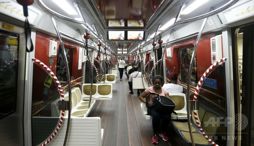 【12月2日 AFP】ブラジルのサンパウロ(Sao Paulo)市内を走る、サンパウロ地下鉄(Sao Paulo Metro)4号線(通称イエローライン)のクリスマス向け特別仕様車両。車内にはクリスマスオーナメントやリボンなどのイメージが施されており、普段とは違う雰囲気が味わえそうだ。(c)AFP