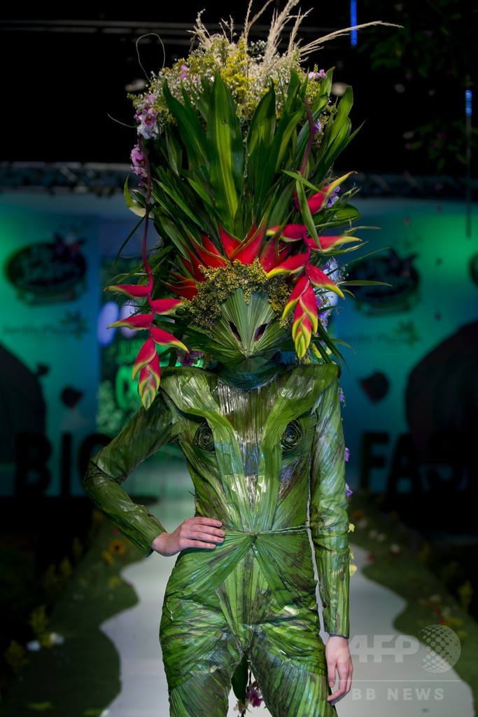 見る人に環境保護への意識を高めてもらおうと企画されたショーでは、草や花、葉や枝といった材料を使った衣装が数多く披露された。(c)AFP