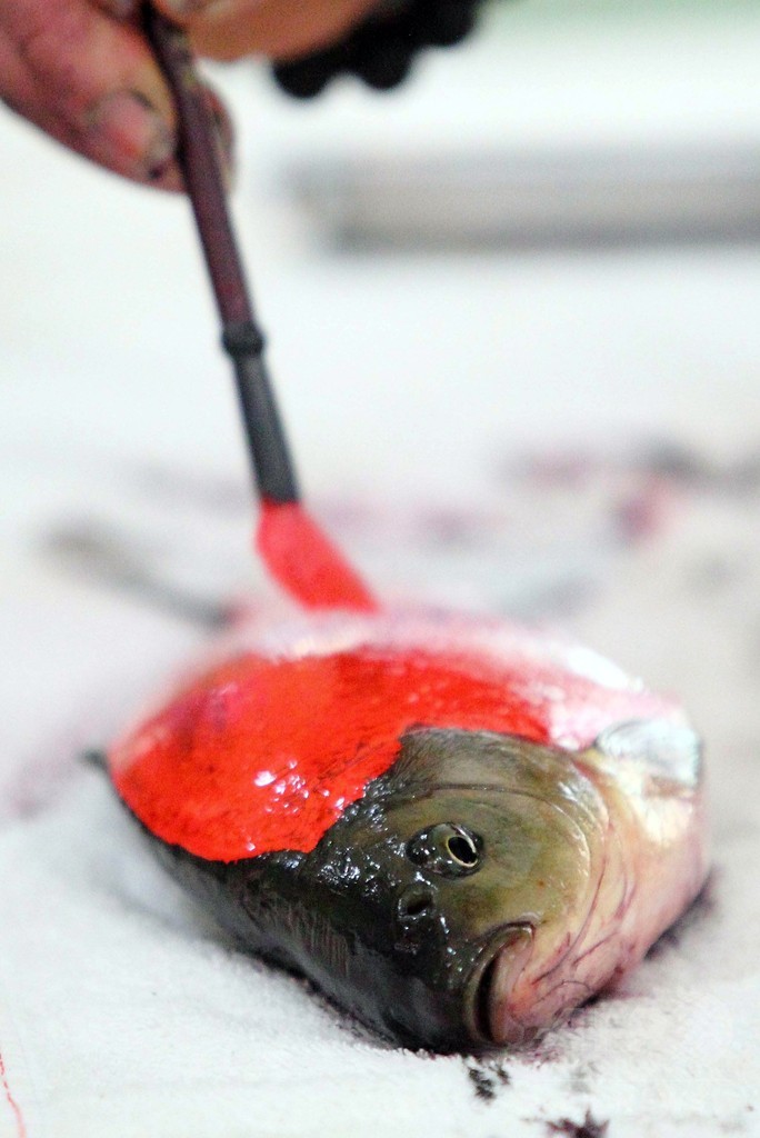 【12月6日 AFP】中国東部・浙江(Zhejiang)省杭州(Hangzhou)で、生きた魚を使って版画を制作する芸術家の韓暁明(Han Xiaoming)さん。作品の完成後、魚はきれいに洗って解放されたという。韓さんは、自らの舌を絵筆のように使って絵を描くアーティストとしても知られている。(c)AFP