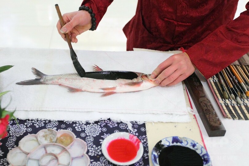 【12月6日 AFP】中国東部・浙江(Zhejiang)省杭州(Hangzhou)で、生きた魚を使って版画を制作する芸術家の韓暁明(Han Xiaoming)さん。作品の完成後、魚はきれいに洗って解放されたという。韓さんは、自らの舌を絵筆のように使って絵を描くアーティストとしても知られている。(c)AFP