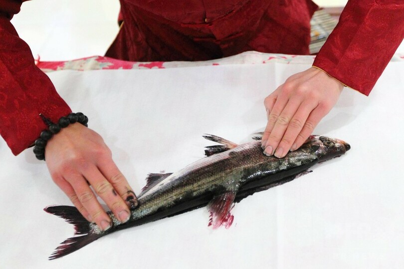 【12月6日 AFP】中国東部・浙江(Zhejiang)省杭州(Hangzhou)で、生きた魚を使って版画を制作する芸術家の韓暁明(Han Xiaoming)さん。作品の完成後、魚はきれいに洗って解放されたという。韓さんは、自らの舌を絵筆のように使って絵を描くアーティストとしても知られている。(c)AFP