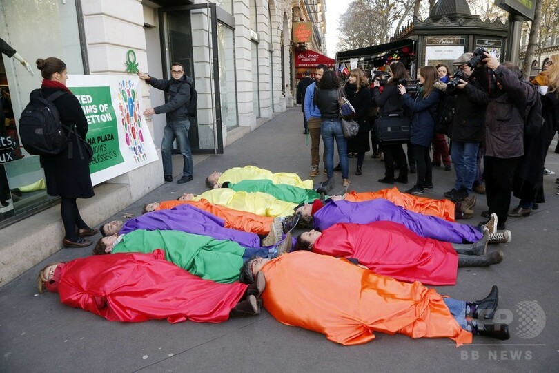 【12月10日 AFP】仏パリ、オペラ座広場近くの「ベネトン(Benetton)」前でロビー団体、Peuples SolidairesとEthique sur l'etiquetteの活動家らが9日、2013年にバングラデシュの首都ダッカ(Dhaka)近郊で起こった「ラナ・プラザ(Rana Plaza)」崩壊事故の遺族への損害賠償金支払いを求め、抗議活動を行った。