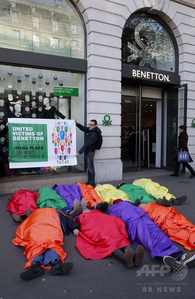 【12月10日 AFP】仏パリ、オペラ座広場近くの「ベネトン(Benetton)」前でロビー団体、Peuples SolidairesとEthique sur l'etiquetteの活動家らが9日、2013年にバングラデシュの首都ダッカ(Dhaka)近郊で起こった「ラナ・プラザ(Rana Plaza)」崩壊事故の遺族への損害賠償金支払いを求め、抗議活動を行った。