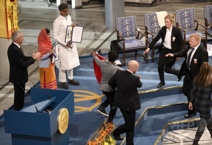 【12月10日 AFP】(一部更新)ノルウェーのオスロ(Oslo)で10日に行われたノーベル平和賞(Nobel Peace Prize)の授賞式で、マララ・ユスフザイ(Malala Yousafzai)さんら受賞者2人が上がった壇上に男が乱入し、メキシコ国旗を掲げる騒動があった。