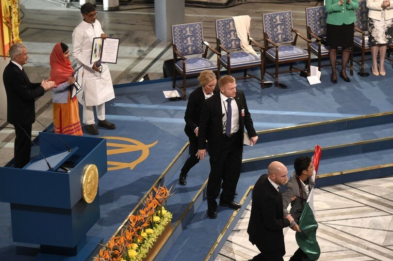 【12月10日 AFP】(一部更新)ノルウェーのオスロ(Oslo)で10日に行われたノーベル平和賞(Nobel Peace Prize)の授賞式で、マララ・ユスフザイ(Malala Yousafzai)さんら受賞者2人が上がった壇上に男が乱入し、メキシコ国旗を掲げる騒動があった。
