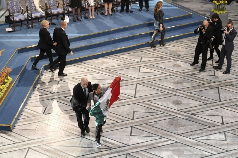 ノーベル授賞式に男乱入、メキシコ国旗掲げる