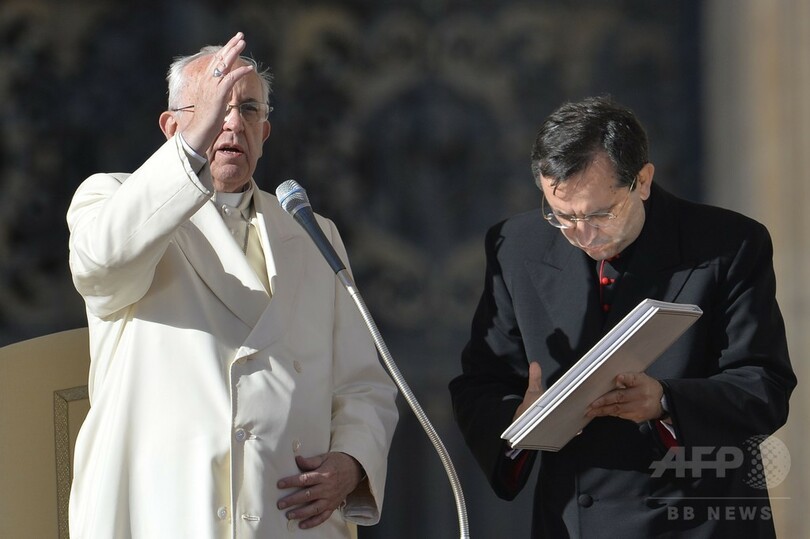【12月11日 AFP】バチカン市国のサンピエトロ広場(St Peter's Square)で10日、ローマ・カトリック教会のフランシスコ(Francis)法王が恒例の一般謁見中、法王の象徴である白い帽子を風に吹き飛ばされてしまうハプニングが起きた。