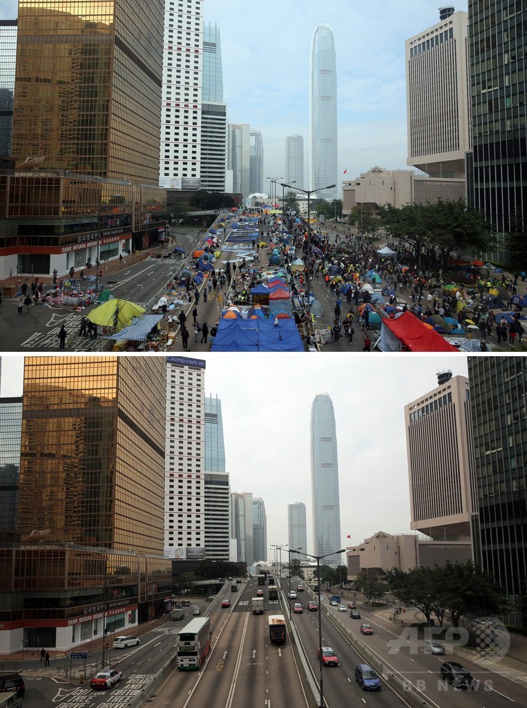 ニュース 政治・経済 香港デモ拠点の強制撤去、前後の写真 2014年12月12日 16:31 発信地:香港 このニュースをシェア ‹ › ❮ 3/4 ❯ 香港の民主派デモの最大拠点だった金鐘(アドミラルティ、Admiralty)地区の道路に残るテントやデモ参加者(上、2014年12月11日撮影)と、強制撤去により交通が回復した同じ道路(同12日撮影)。(c)AFP/ISAAC LAWRENCE 画像作成中 ! 【12月12日 AFP】香港(Hong Kong)で、2か月以上におよぶ民主派による街頭占拠デモの最大拠点となっていた金鐘(アドミラルティ、Admiralty)地区の11日と12日の写真。 上の写真は警官隊がデモの拠点を強制撤去するなか11日に撮影された。下の写真はその24時間後に撮影され、2か月ぶりに車の通行が戻った道路の様子が捉えられている。 警察当局は金鐘地区のデモの拠点を強制撤去し、デモの参加者多数を逮捕した。だが民主派の活動家らは今後も闘いを続けると宣言している。(c)AFP 政治・経済 一覧へ> メディア・報道関係・法人の方向け 写真・動画 購入のお問合せ>