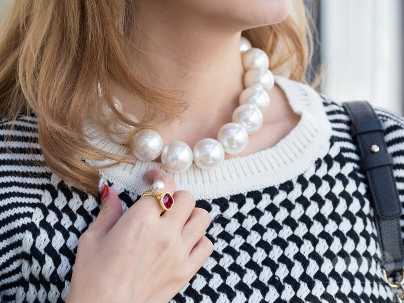 千鳥格子柄のセットアップには、チェーンバッグを合わせてレトロにコーディネート。