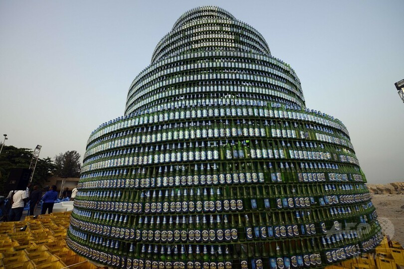 【12月19日 AFP】ナイジェリア・ラゴス(Lagos)に出現した巨大「ビール瓶ツリー」。同国のビール産業のパイオニア的存在であるナイジェリアン・ブルワリーズ(Nigerian Breweries)社のビール「スター・ラガー(Star Lager)」の瓶8000本使って完成した。スター・ラガーは初の国産ビールとして知られている。(c)AFP