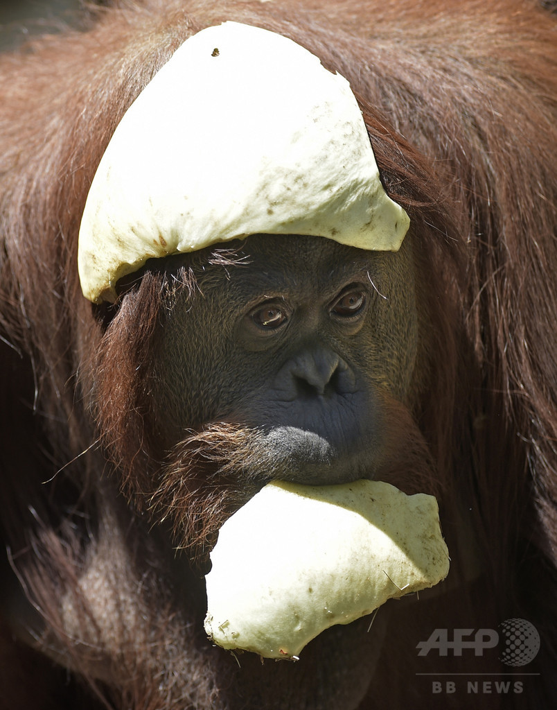 【12月23日 AFP】アルゼンチンで先週、より望ましい居住環境で暮らすために動物園から出る権利が裁判所によって認められ、一躍有名となったオランウータンの「サンドラ(Sandra)」は22日、飼育場の周りに集まった大勢の報道陣にも平然とした様子で、メロンを食べたりその皮を頭に乗せたりしてカメラの前で愛嬌を振りまいた。
