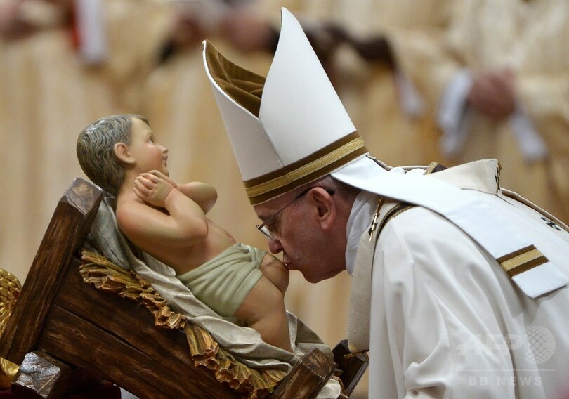 金の縁取りが付いた白い祭服を身に着けた法王は、広い大聖堂に入ると、生まれたばかりの笑みを浮かべたイエスキリストの小像から布を取り、口づけをした。