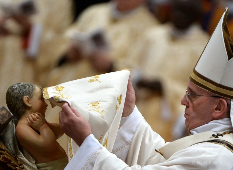 金の縁取りが付いた白い祭服を身に着けた法王は、広い大聖堂に入ると、生まれたばかりの笑みを浮かべたイエスキリストの小像から布を取り、口づけをした。