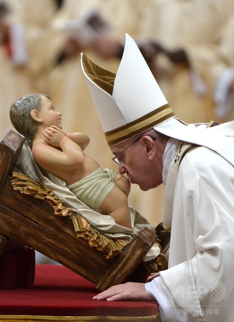 金の縁取りが付いた白い祭服を身に着けた法王は、広い大聖堂に入ると、生まれたばかりの笑みを浮かべたイエスキリストの小像から布を取り、口づけをした。