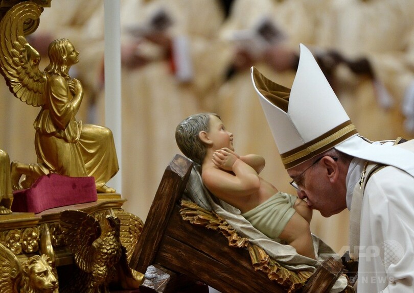 金の縁取りが付いた白い祭服を身に着けた法王は、広い大聖堂に入ると、生まれたばかりの笑みを浮かべたイエスキリストの小像から布を取り、口づけをした。