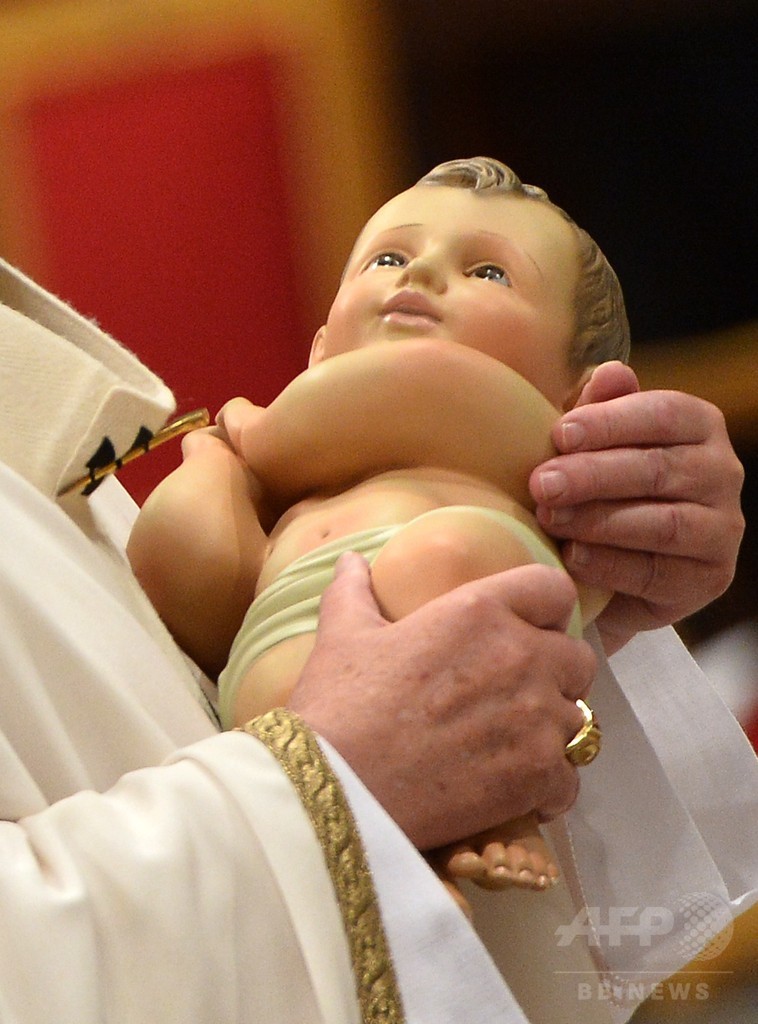 金の縁取りが付いた白い祭服を身に着けた法王は、広い大聖堂に入ると、生まれたばかりの笑みを浮かべたイエスキリストの小像から布を取り、口づけをした。