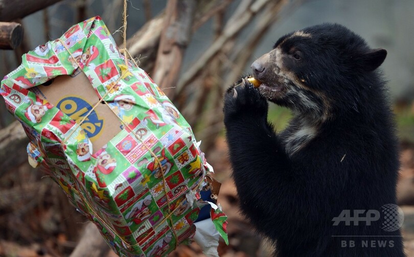 【12月26日 AFP】独フランクフルト・アムマイン(Frankfurt am Main)にある動物園で25日、1歳になったメガネグマの雄の双子トゥパとソンコにクリスマス兼誕生日のプレゼントが用意された。プレゼントの箱にはリンゴがぎっしりと詰まっていた。(c)AFP