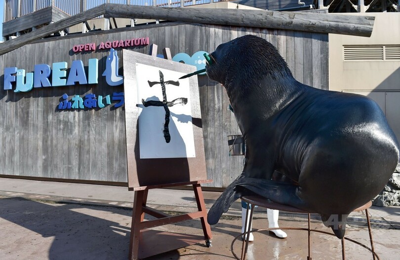 【12月31日 AFP】神奈川県横浜市の「横浜・八景島シーパラダイス(Yokohama Hakkeijima Sea Paradise)」で、オタリアが15年1月1日から始まる新年イベントに向けて、来年のえと「未(ひつじ)」の文字の習字の特訓中だ。オタリアの書き初めイベントは、15年の元日から2月1日まで。(c)AFP