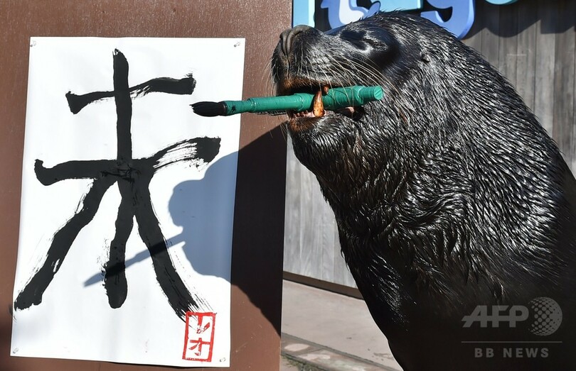【12月31日 AFP】神奈川県横浜市の「横浜・八景島シーパラダイス(Yokohama Hakkeijima Sea Paradise)」で、オタリアが15年1月1日から始まる新年イベントに向けて、来年のえと「未(ひつじ)」の文字の習字の特訓中だ。オタリアの書き初めイベントは、15年の元日から2月1日まで。(c)AFP