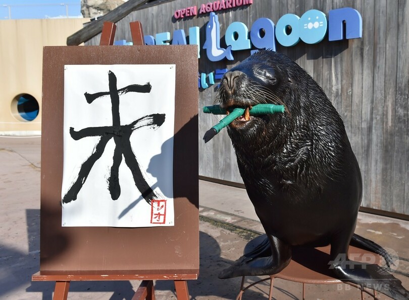 【12月31日 AFP】神奈川県横浜市の「横浜・八景島シーパラダイス(Yokohama Hakkeijima Sea Paradise)」で、オタリアが15年1月1日から始まる新年イベントに向けて、来年のえと「未(ひつじ)」の文字の習字の特訓中だ。オタリアの書き初めイベントは、15年の元日から2月1日まで。(c)AFP