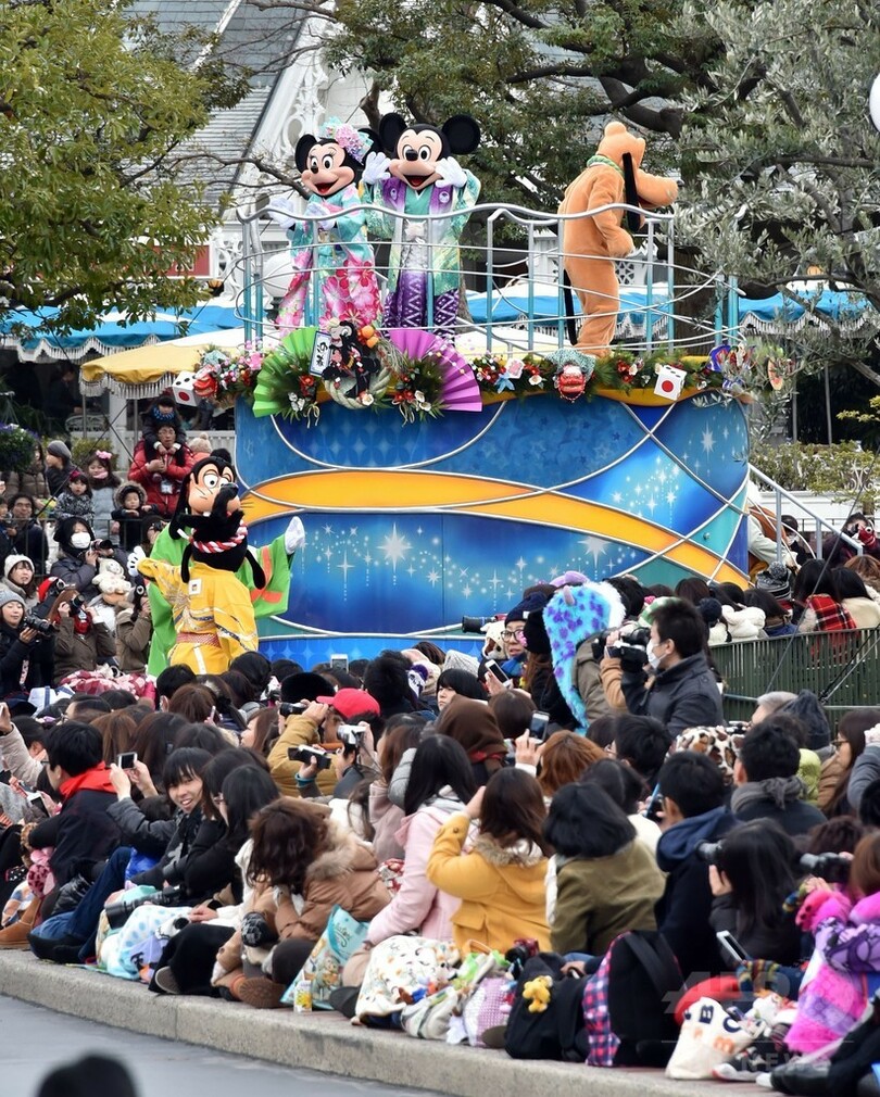 【1月1日 AFP】千葉県浦安市の東京ディズニーランド(Tokyo Disneyland)で1日、正月限定のパレードが行われ、和服姿のミッキーマウス(Mickey Mouse)とミニーマウス(Minnie Mouse)が来場者らと新年を祝った。(c)AFP