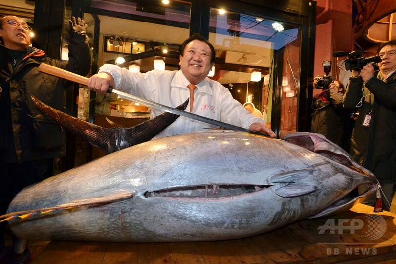 最高値が付いた180キロのクロマグロを競り落としたのは、すしチェーン「すしざんまい(Sushi-Zanmai)」を展開する「喜代村(Kiyomura)」で、同社の木村清(Kiyoshi Kimura)社長がすしざんまい店舗前で解体を披露した。(c)AFP/Yoshikazu TSUNO
