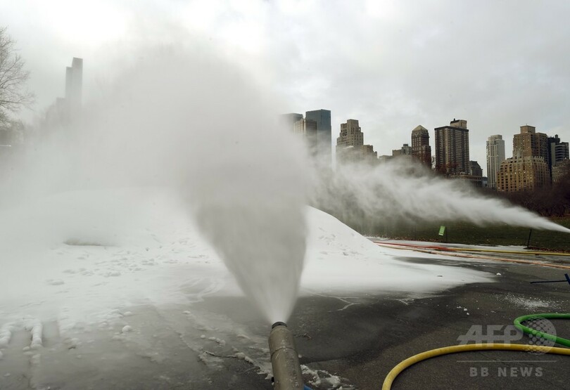 実はこれ、24日に開催される恒例の雪まつり「ウインタージャム(Winter Jam)」に向けた準備で、人工雪を降らせている様子。ニューヨーカーなら老若男女を問わず無料で楽しめる同イベントでは、ふかふかの雪の上でスキーやそり滑り、スノーシューイングなどのスポーツが体験できるほか、ウインター・マーケットも開かれる。(c)AFP