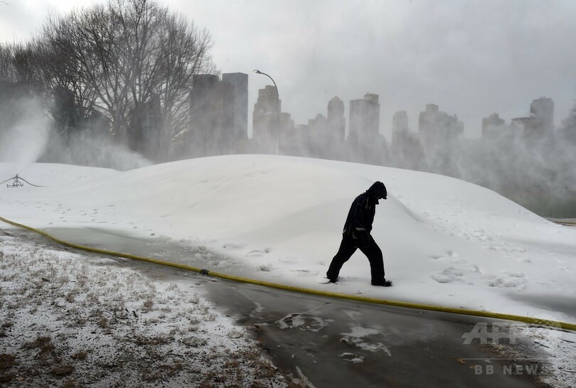 実はこれ、24日に開催される恒例の雪まつり「ウインタージャム(Winter Jam)」に向けた準備で、人工雪を降らせている様子。ニューヨーカーなら老若男女を問わず無料で楽しめる同イベントでは、ふかふかの雪の上でスキーやそり滑り、スノーシューイングなどのスポーツが体験できるほか、ウインター・マーケットも開かれる。(c)AFP