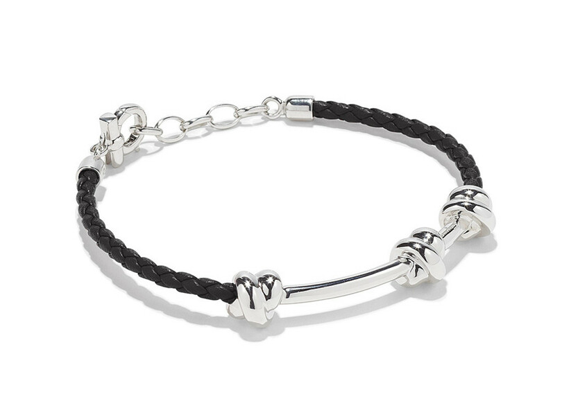 小さなシルバーのノットが3つならんだレザーブレスレットは、ブラック、ブルー、レッドの3色展開。留め金の位置によってサイズ調節も可能。スターリングシルバーとレザーのコンビネーションが上品で美しいブレスレットは、恋人に限らず家族や大切な友人への贈り物や記念品としても最適だ。価格は3万8000円(税抜)。