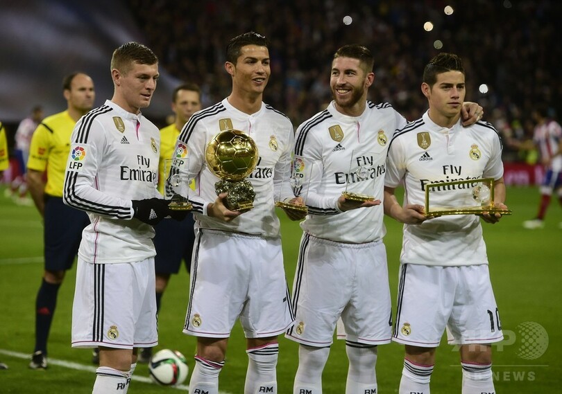 サッカースペイン国王杯(Copa del Rey 2014-15)5回戦第2戦、レアル・マドリード(Real Madrid)対アトレティコ・マドリード(Atletico de Madrid)。試合前に2014年の国際サッカー連盟(FIFA)表彰で受け取ったトロフィーを手にポーズをとるレアル・マドリードの(左から)トニ・クロース(Toni Kroos)、クリスティアーノ・ロナウド(Cristiano Ronaldo)、セルヒオ・ラモス(Sergio Ramos)、ハメス・ロドリゲス(James Rodriguez、2015年1月15日撮影)。(c)AFP/PIERRE-PHILIPPE MARCOU