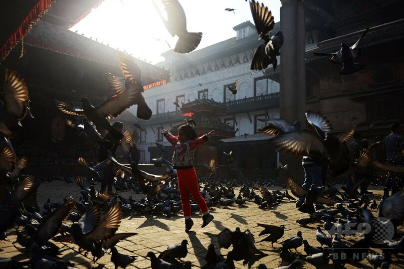 【1月20日 AFP】ネパールの首都カトマンズ(Kathmandu)のダルバール広場(Durbar Square)で、ハトの群れと共に飛び跳ねる少女。かつてこの都市を治めた2つの王朝、マッラ(Malla)王朝とシャー(Shah)王朝の宮殿があった同広場は、国連教育科学文化機関(ユネスコ、UNESCO)の世界遺産(World Heritage)に登録されている。(c)AFP
