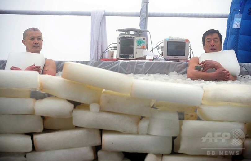 【1月26日 AFP】中国中部・湖南(Hunan)省張家界(Zhangjiajie)市で25日、耐寒コンテストが開催され、参加者たちは扇風機から風が吹き付ける中、氷が浮かぶ水槽に浸かりながら氷のブロックを腕に抱え、さらにアイスクリームをほおばりながら我慢比べに興じた。(c)AFP