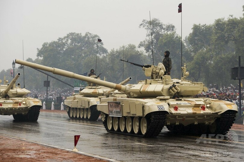 あいにくの雨天と厳戒な警備の中、近代インドの誕生を祝うパレードを数千人の観衆が見届けた。パレードにはインドの伝統舞踊やラクダの行進から、戦車や最先端の兵器までが登場した。(c)AFP/Claire COZENS