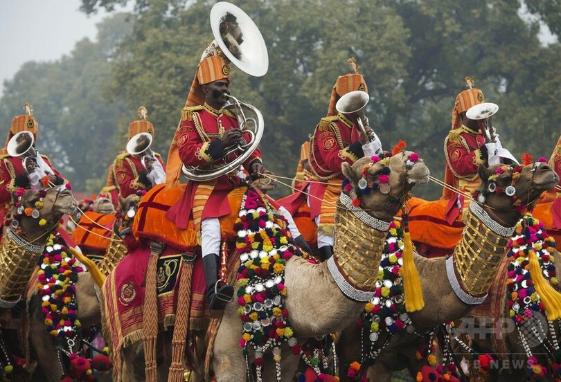 あいにくの雨天と厳戒な警備の中、近代インドの誕生を祝うパレードを数千人の観衆が見届けた。パレードにはインドの伝統舞踊やラクダの行進から、戦車や最先端の兵器までが登場した。(c)AFP/Claire COZENS