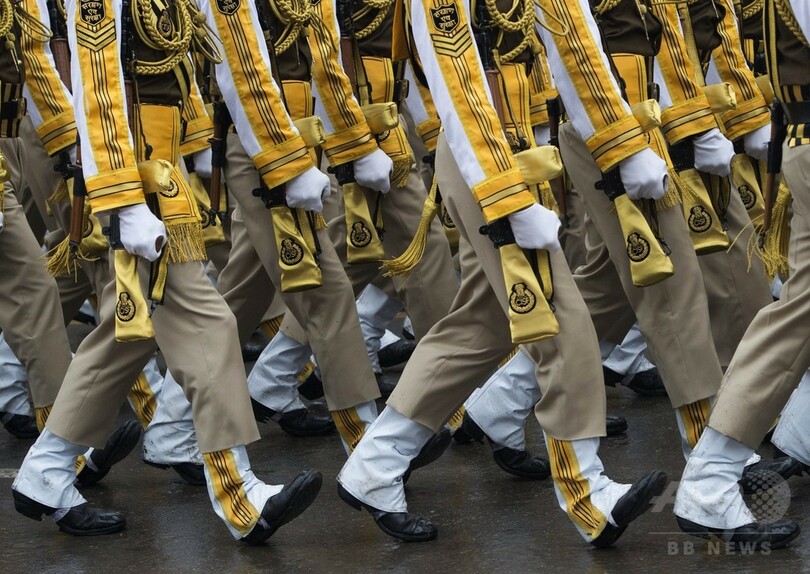 あいにくの雨天と厳戒な警備の中、近代インドの誕生を祝うパレードを数千人の観衆が見届けた。パレードにはインドの伝統舞踊やラクダの行進から、戦車や最先端の兵器までが登場した。(c)AFP/Claire COZENS