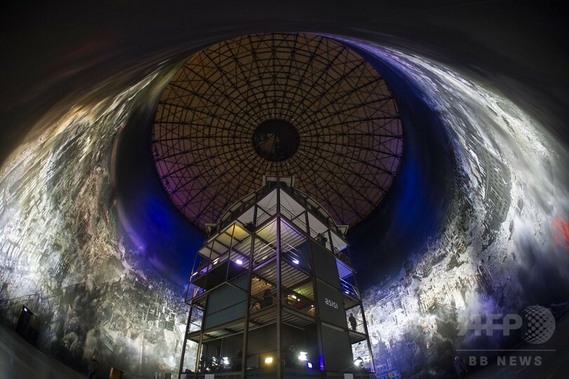 ベルリン(Berlin)を拠点に活動するアーティストのヤデガー・アシシ(Yadegar Asisi)氏が制作した同作品は、高さ30メートル以上、円周100メートルと巨大だ。中心部に設置された高さ15メートルの櫓(やぐら)から鑑賞するよう設計されており、70年前の空襲で大きな被害を受けた街の全貌を、まるで当時の市庁舎の塔の上から眺めているような感覚で見ることができるという。(c)AFP