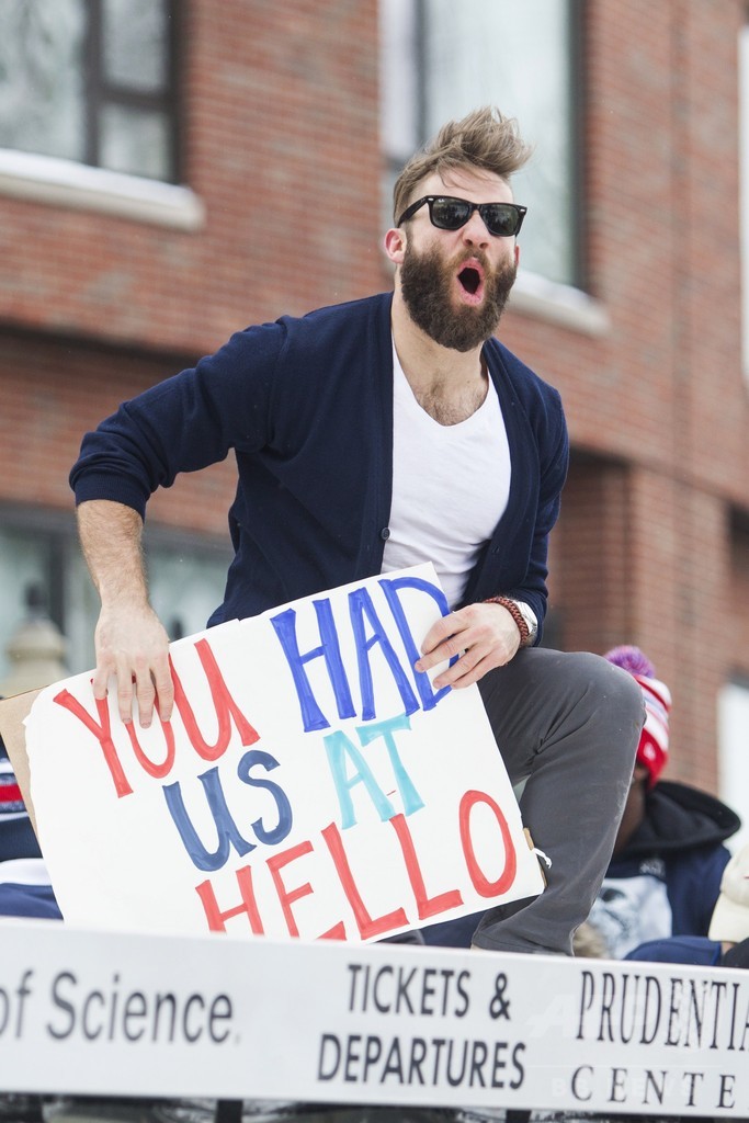 選手のなかで最も注目を浴びていたのはジュリアン・エデルマン(Julian Edelman)で、パレード車の屋根に上り、シーホークスのリチャード・シャーマン(Richard Sherman)の大きな写真を掲げてあざける場面があった。(c)AFP