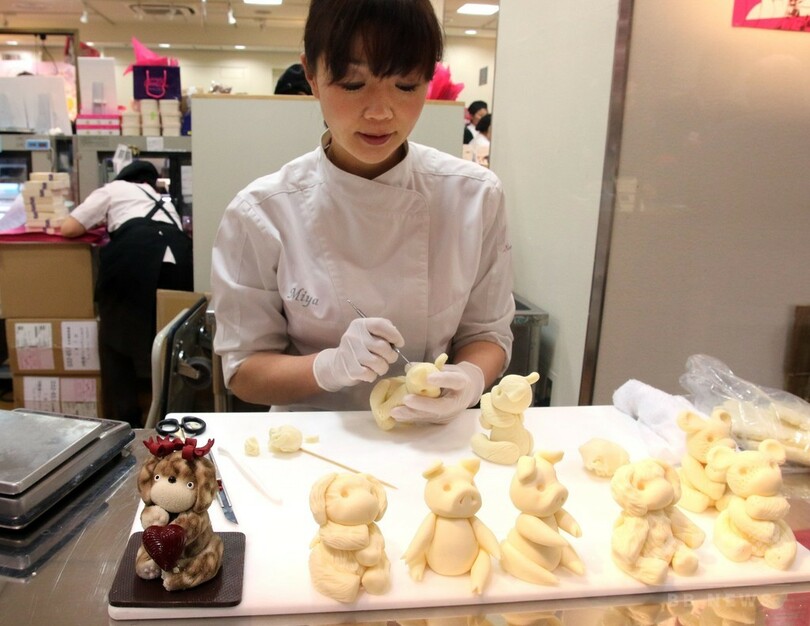 【2月5日 AFP】バレンタインデーに向けて高島屋(Takashimaya)日本橋店でショコラの祭典「アムール・デュ・ショコラ(Amour du Chocolat)」が開催されている。1階ホールには、パティスリー・エチエンヌ(Patisserie Etienne)のスイートアートデザイナー藤本美弥(Miya Fujimoto)さんが作った、マンガ「東京タラレバ娘(Tokyo Tarareba-musume)」のチョコフィギュア2体が展示された。材料には計300キロのチョコレートが使用されたという。(c)AFP