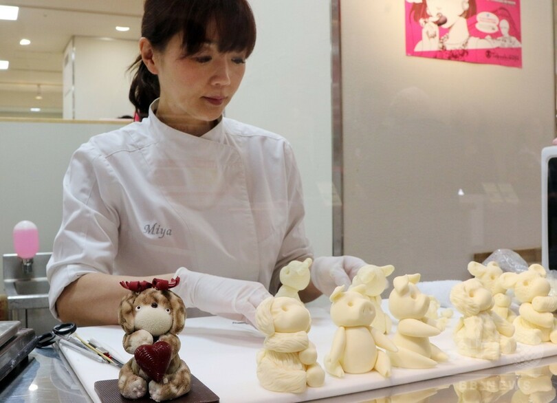 【2月5日 AFP】バレンタインデーに向けて高島屋(Takashimaya)日本橋店でショコラの祭典「アムール・デュ・ショコラ(Amour du Chocolat)」が開催されている。1階ホールには、パティスリー・エチエンヌ(Patisserie Etienne)のスイートアートデザイナー藤本美弥(Miya Fujimoto)さんが作った、マンガ「東京タラレバ娘(Tokyo Tarareba-musume)」のチョコフィギュア2体が展示された。材料には計300キロのチョコレートが使用されたという。(c)AFP