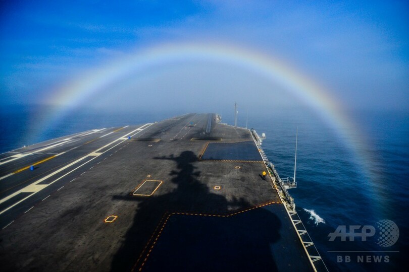 空母にかかる虹のアーチ